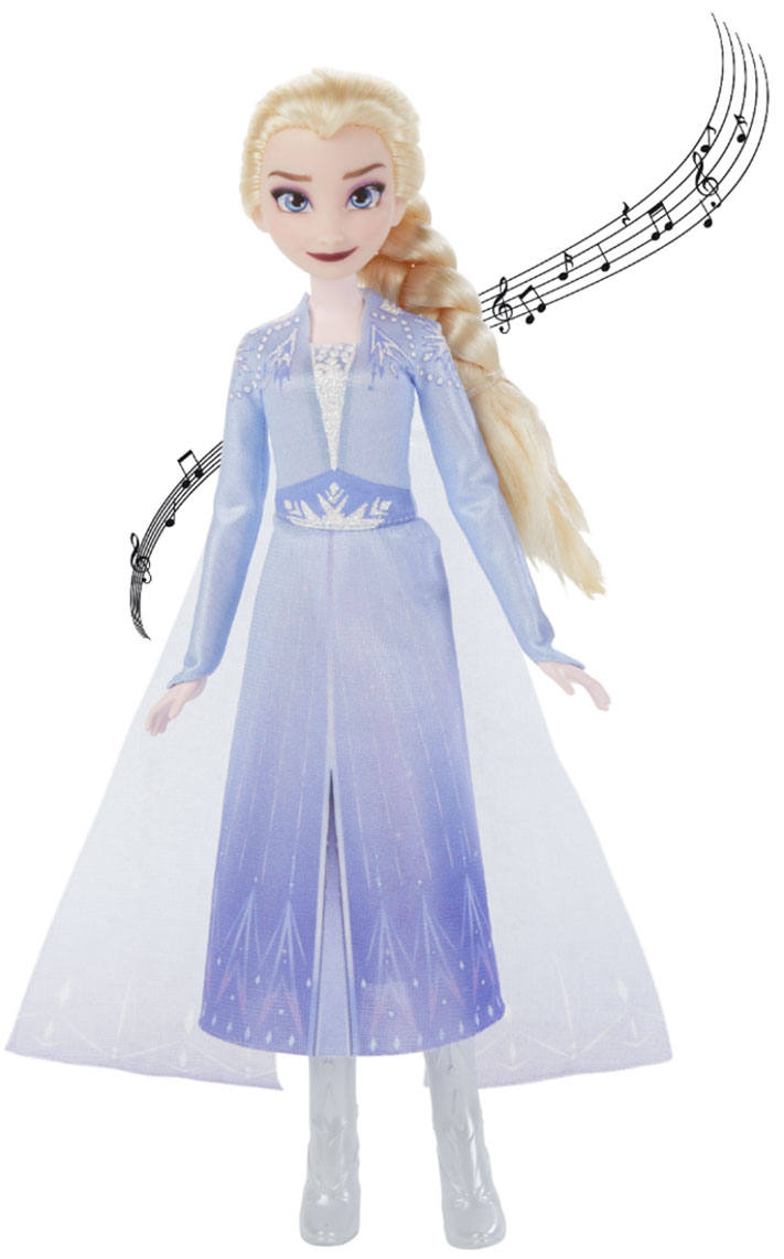 Découvre la toute nouvelle Poupée Elsa de La Reine Des Neiges 2. Elle parle et chante la nouvelle chanson du film et sa jolie robe violette s‘illumine en levant son bras. La poupée mesure 38 cm.