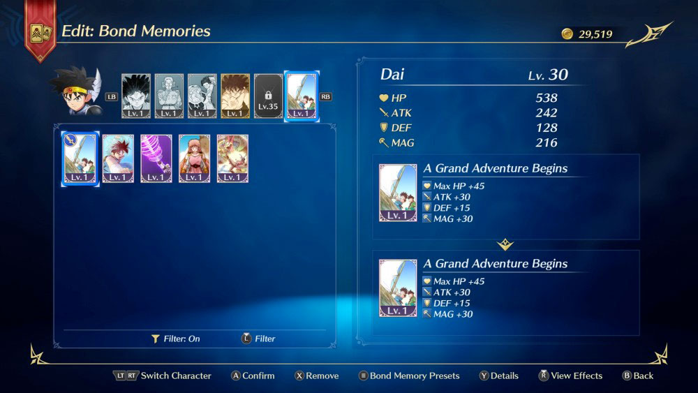 - Les personnages équipés de souvenirs verront leurs capacités s’améliorer de diverses façons, et ils pourront en utiliser davantage simultanément à mesure qu’ils gagneront des niveaux.