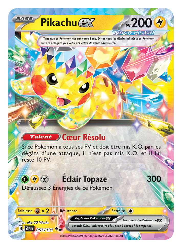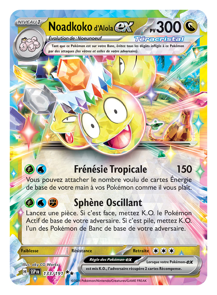 Dans l’extension Écarlate et Violet – Étincelles Déferlantes du JCC Pokémon, les joueurs et joueuses peuvent continuer à découvrir de magnifiques Pokémon-ex Téracristal Stellaire, dont Pikachu-ex avec sa puissante attaque Éclair Topaze. Les fans du DLC Le trésor enfoui de la Zone Zéro, Volume 2 : Le Disque Indigo, pourront collectionner les cartes de cette extension et combattre avec celles-ci sur le thème du Terra-Dôme (un paradis artificiel tout d’abord introduit dans le DLC pour les jeux vidéo Pokémon Écarlate et Pokémon Violet), et pourront découvrir le gigantesque Noadkoko d’Alola en tant que Pokémon-ex Téracristal Stellaire ainsi que d’autres Pokémon puissants de type Dragon.