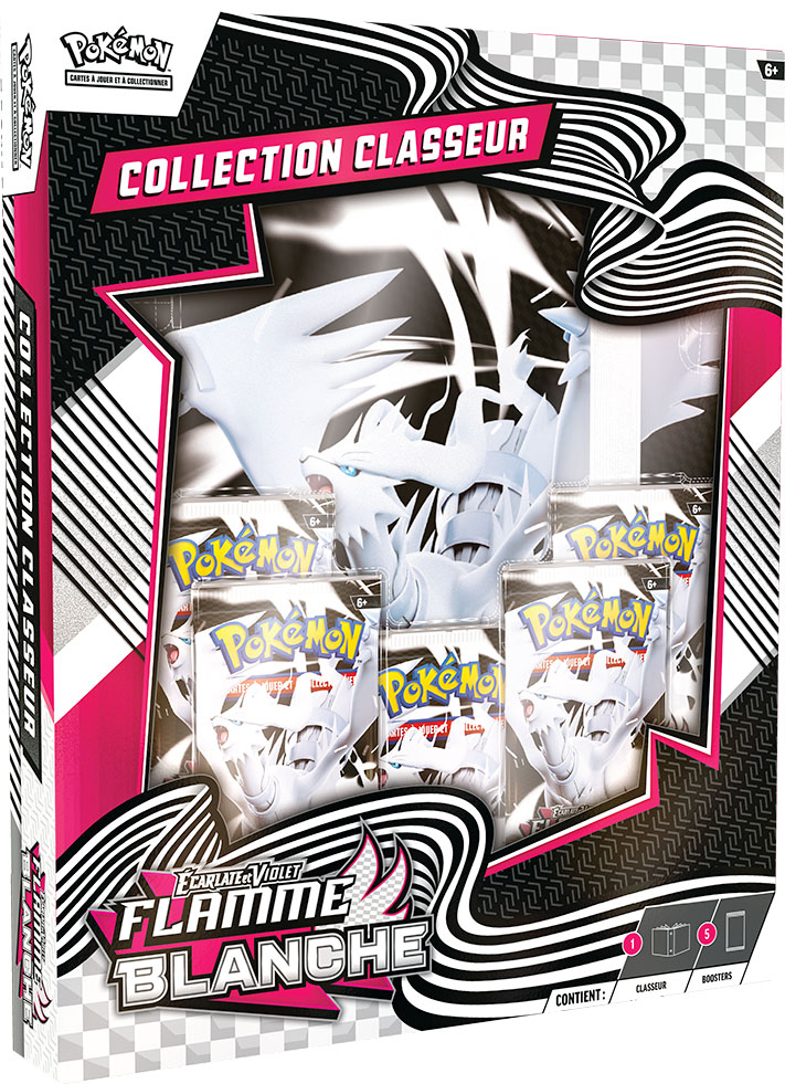 - Collection classeur Écarlate et Violet – Foudre Noire ou Écarlate et Violet – Flamme Blanche (disponible le 18 juillet 2025) contenant respectivement : 5 boosters Écarlate et Violet – Foudre Noire ou Écarlate et Violet – Flamme Blanche ; et 1 album avec 9 pochettes par page présentant Zekrom ou Reshiram, pour organiser et garder les cartes du JCC Pokémon.