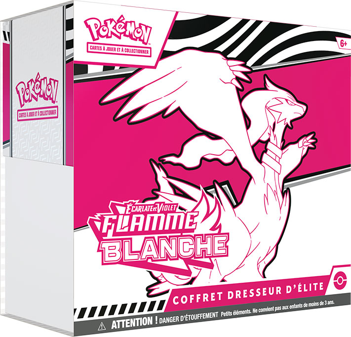 - Coffret Dresseur d’élite Écarlate et Violet – Foudre Noire ou Écarlate et Violet – Flamme Blanche (disponible le 18 juillet 2025) contenant respectivement : 9 boosters Écarlate et Violet – Foudre Noire ou Écarlate et Violet – Flamme Blanche ; 1 carte promo au style « illustration rare » présentant Fulguris ou Boréas ; et des accessoires de jeu divers.