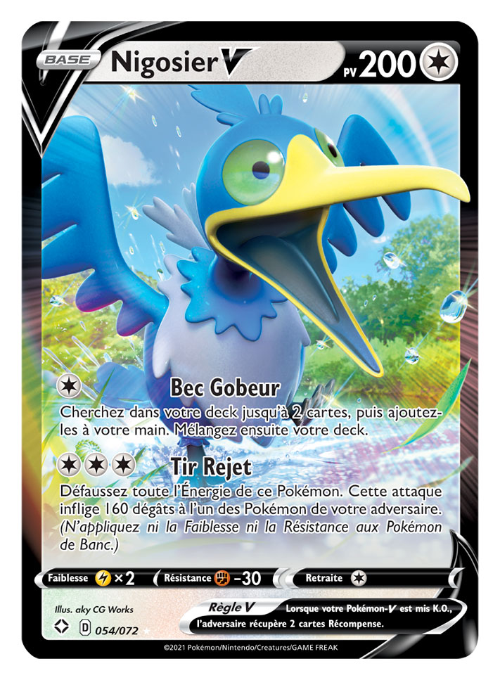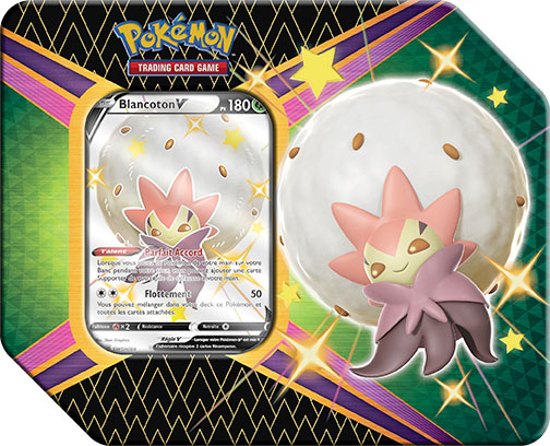 Les Boîtes Destinées Radieuses contiennent 5 boosters de Destinées Radieuses et 1 carte promo brillante des Pokémon chromatiques Blancoton-V, Fulgudog-V ou Nigosier-V.