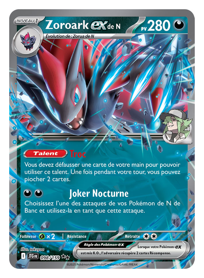Par ailleurs, il est maintenant possible de jouer avec Écarlate et Violet – Aventures Ensemble dans l’application du JCC Pokémon Live sur les appareils sous iOS, Android, macOS et Windows. Vous pouvez collectionner de nouvelles cartes de Pokémon de Dresseurs et Dresseuses et combattre avec elles. En outre, la toute nouvelle fonctionnalité des Tests de Dresseurs et Dresseuses offre aux joueurs et joueuses un nouveau mode de jeu avec une série de formats en rotation, y compris le Défi du Champion d’Arène, permettant d’expérimenter de nouvelles façons de jouer au JCC Pokémon. Vous trouverez plus d’informations sur les Tests de Dresseurs et Dresseuses et le calendrier des formats ici. Lors de la connexion, le Passe de combat Écarlate et Violet – Aventures Ensemble récompensera les Dresseurs et Dresseuses avec un nouveau deck mettant en vedette Zacian-ex de Nabil, et un deck supplémentaire centré sur Zoroark-ex de N pourra être déverrouillé en jouant.