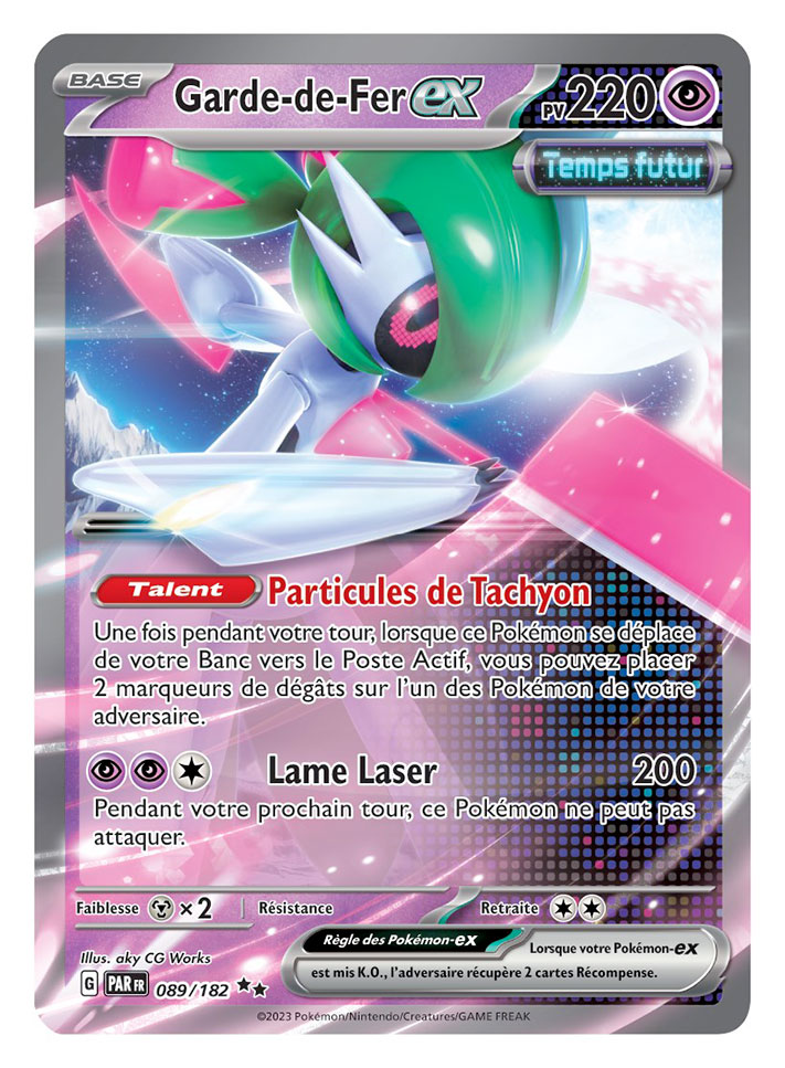 Inspirée par les Pokémon Paradoxe des jeux vidéo Pokémon Écarlate et Pokémon Violet, l’extension Écarlate et Violet – Faille Paradoxe introduit les Pokémon Temps passé et Temps futur ainsi que des cartes Dresseur, comme dévoilé récemment pendant les Championnats du Monde Pokémon 2023. Les Pokémon Temps passé, qui incarnent l’endurance et la puissance, disposent en général d’attaques directes qui infligent de nombreux dégâts, et il est plus difficile de les mettre K.O. Maîtrisant la vitesse et la technique, les Pokémon Temps futur ont des talents et des attaques dont les effets supplémentaires permettent d’élaborer des manœuvres astucieuses et des stratégies ingénieuses. De plus, les cartes Dresseur Temps passé soutiennent en général les Pokémon Temps passé, tandis que les cartes Dresseur Temps futur soutiennent les Pokémon Temps futur.