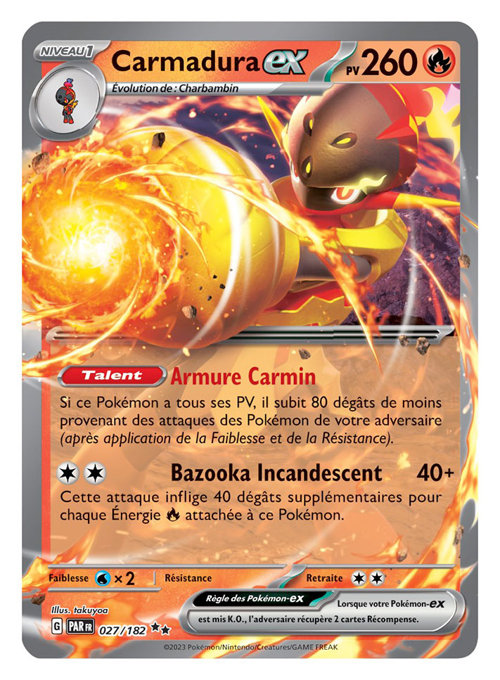 La sortie de cette nouvelle extension marque l’entrée des Pokémon-ex Téracristal dont le type a changé dans le JCC Pokémon et certains des Pokémon-ex Téracristal présenteront une Énergie d’un type différent. Dans Écarlate et Violet – Flammes Obsidiennes, les Dresseurs et Dresseuses verront Dracaufeu-ex en tant que type Obscurité au lieu de son type Feu habituel, et Tyranocif-ex en tant que type Électrique au lieu de son type habituel Combat ou Obscurité. Lorsqu’ils attaquent, les Pokémon-ex Téracristal dont le type a changé utilisent le même type d’Énergie que leur type habituel, mais leur Faiblesse correspondra à leur nouveau type. Ces cartes suivront également les mêmes règles que celles des Pokémon-ex traditionnels : lorsqu’ils sont mis K.O., les Pokémon-ex Téracristal dont le type a changé offriront deux cartes Récompense au lieu d’une.