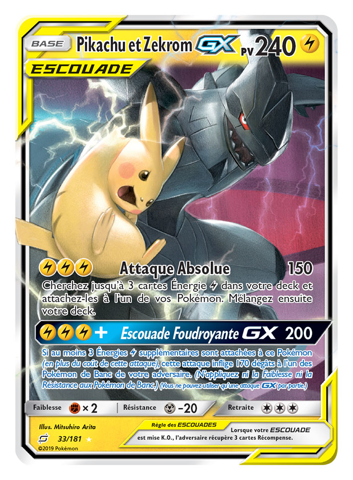 Les Pokémon-GX ESCOUADE permettent une nouvelle mécanique de jeu offrant des combats à hauts risques et à fortes récompenses. Ces cartes possèdent une puissance et des Points de Vie sans pareil, mais lorsqu’une ESCOUADE est mise K.O., l’adversaire remporte trois cartes Récompense.