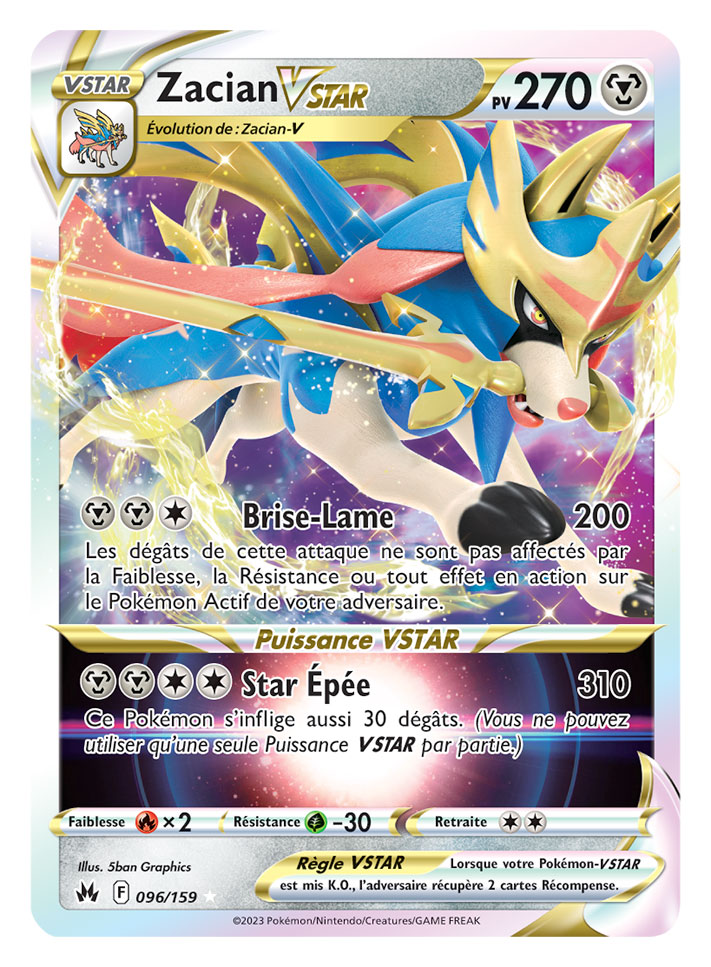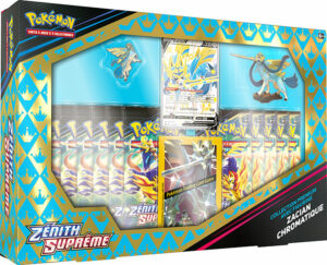 - Collection Premium avec figurine Zénith Suprême – Zacian chromatique ou Zamazenta chromatique : contient 11 boosters Zénith Suprême, une carte promo texturée soit de Zacian-V chromatique soit de Zamazenta-V chromatique, la figurine chromatique et le pin’s chromatique correspondants, et un ensemble de protège-cartes
