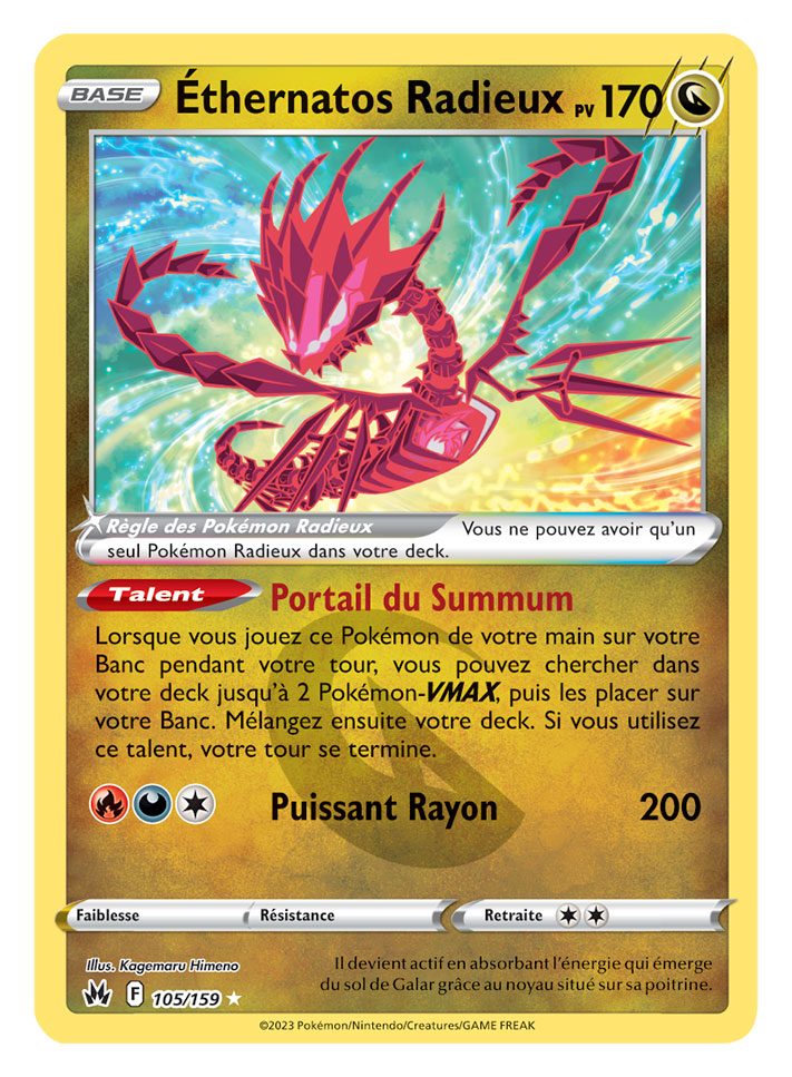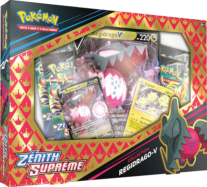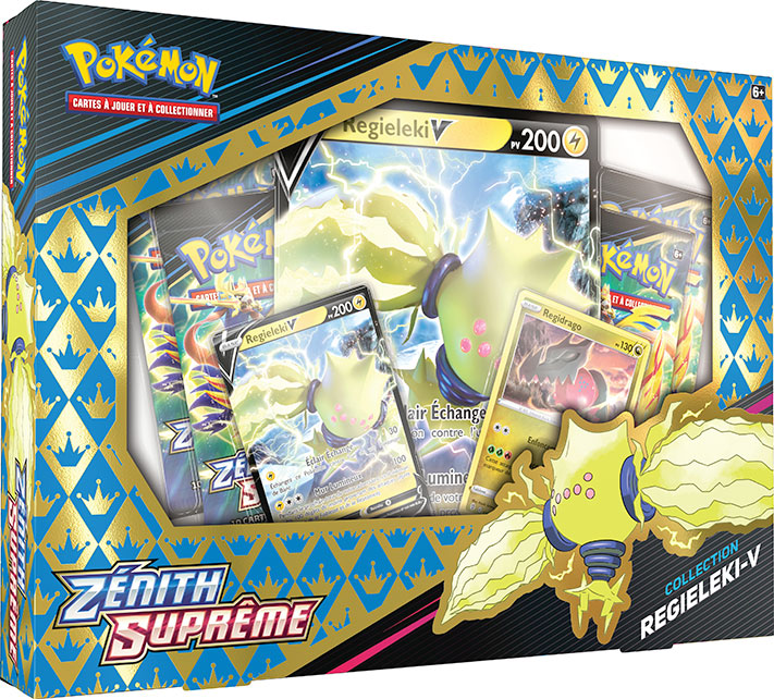 - Collection Zénith Suprême – Regieleki-V ou Regidrago-V : contient 4 boosters Zénith Suprême, une carte promo et une carte grand format de Regieleki-V ou Regidrago-V, et une carte promo brillante supplémentaire