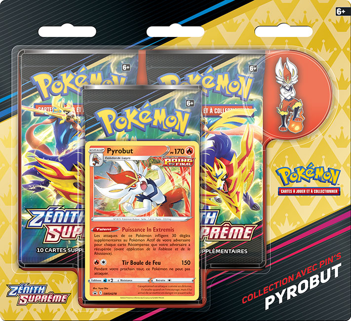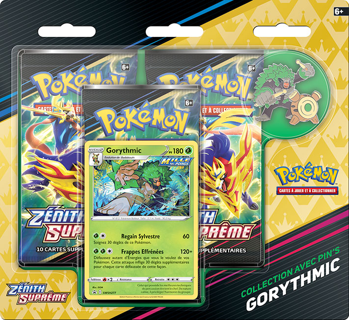 - Collection avec pin’s Zénith Suprême – Gorythmic, Pyrobut ou Lézargus : contient 3 boosters Zénith Suprême, une carte promo de Gorythmic, Pyrobut ou Lézargus, et le pin’s correspondant