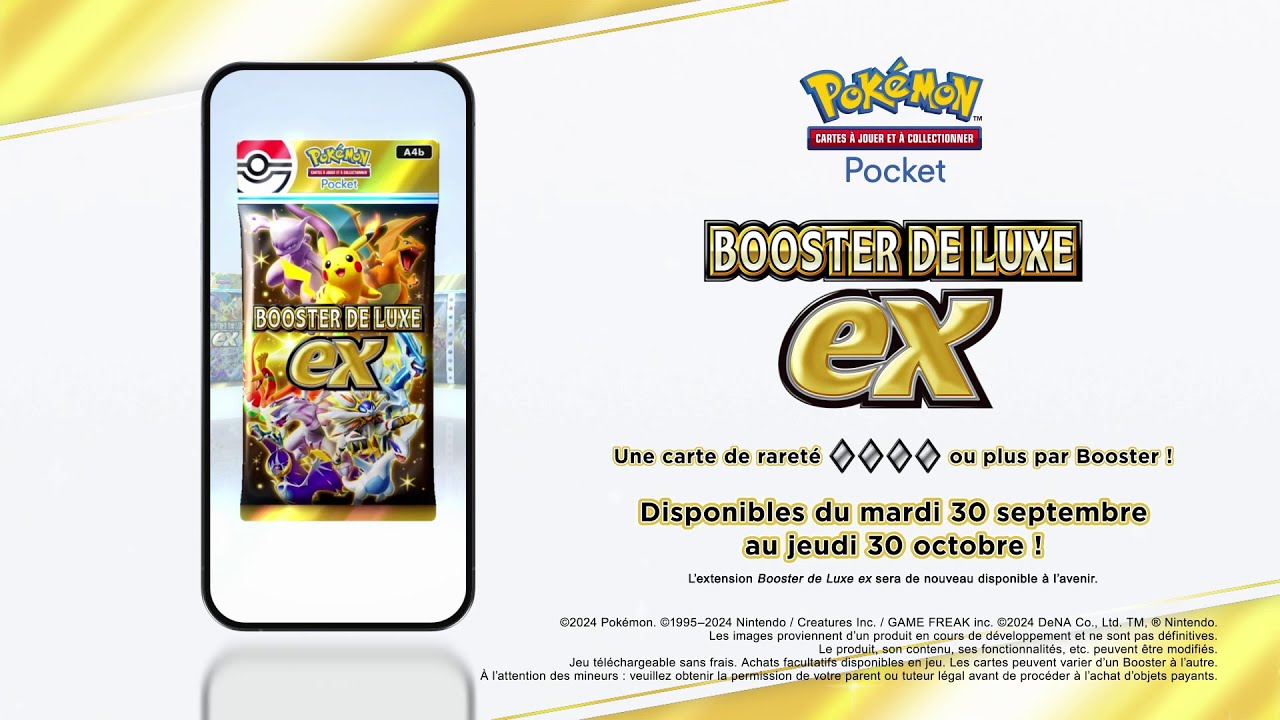 The Pokémon Company International a dévoilé qu’une extension spéciale intitulée Booster de Luxe ex sera disponible dans le Jeu de Cartes à Collectionner Pokémon Pocket du 30 septembre 2025 à 06:00 UTC au 30 octobre 2025 à 05:59 UTC.