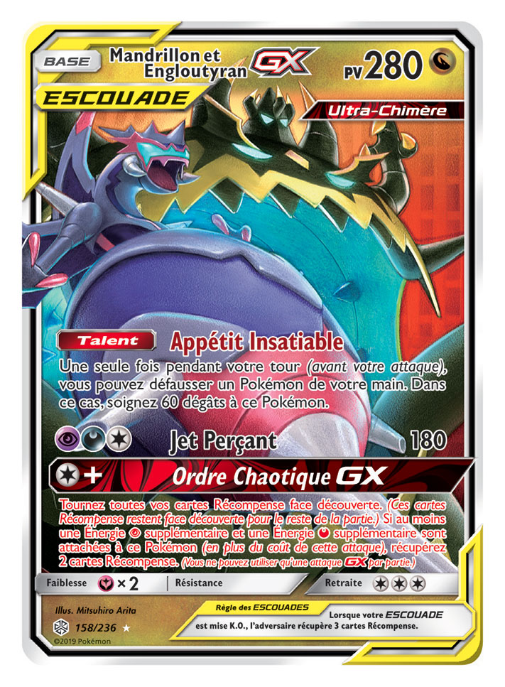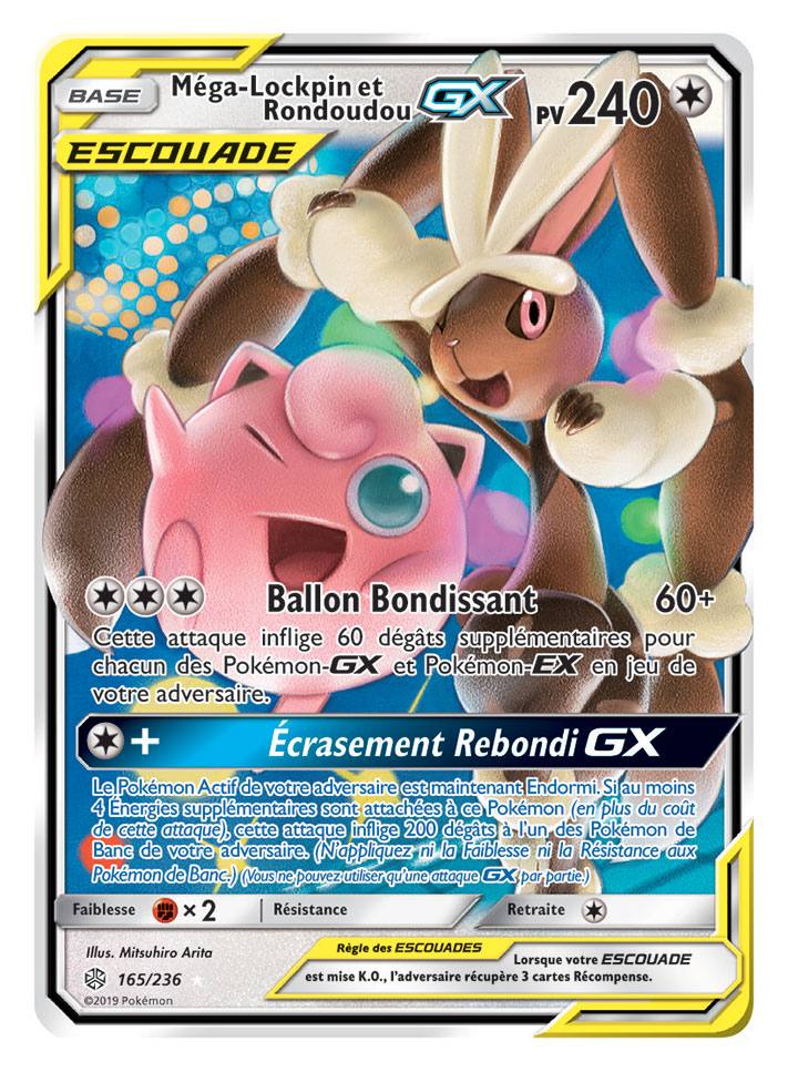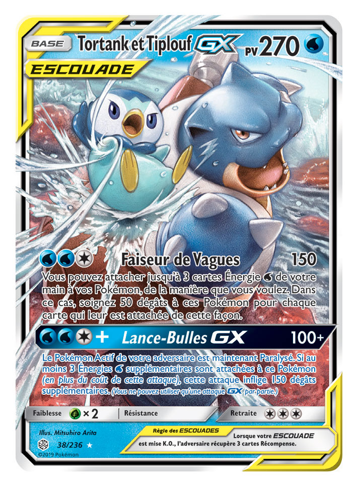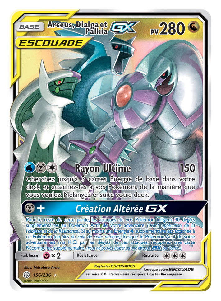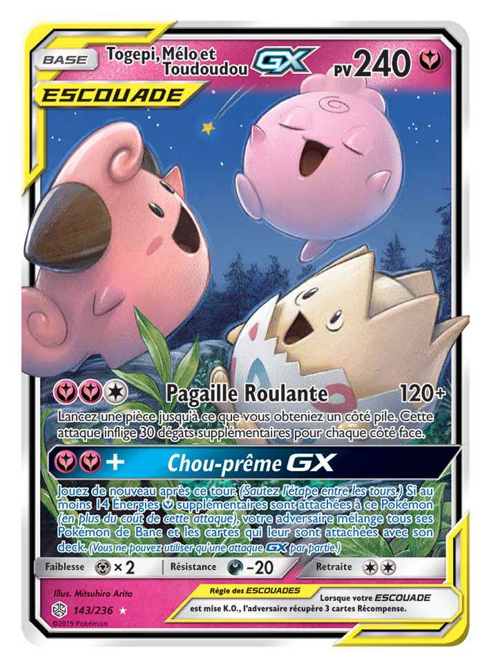 Deux super trios ESCOUADE passent sur scène dans Soleil et Lune – Éclipse Cosmique, que les fans auront autant de plaisir à collectionner qu’à utiliser en combat. Des Pokémon fabuleux et légendaires sont associés sur la carte Arceus, Dialga et Palkia-GX, qui s’avèrera très utile dans tous les decks. Et ne vous fiez pas à leur apparence toute douce : le trio Togepi, Mélo et Toudoudou-GX ne manque pas de puissance !