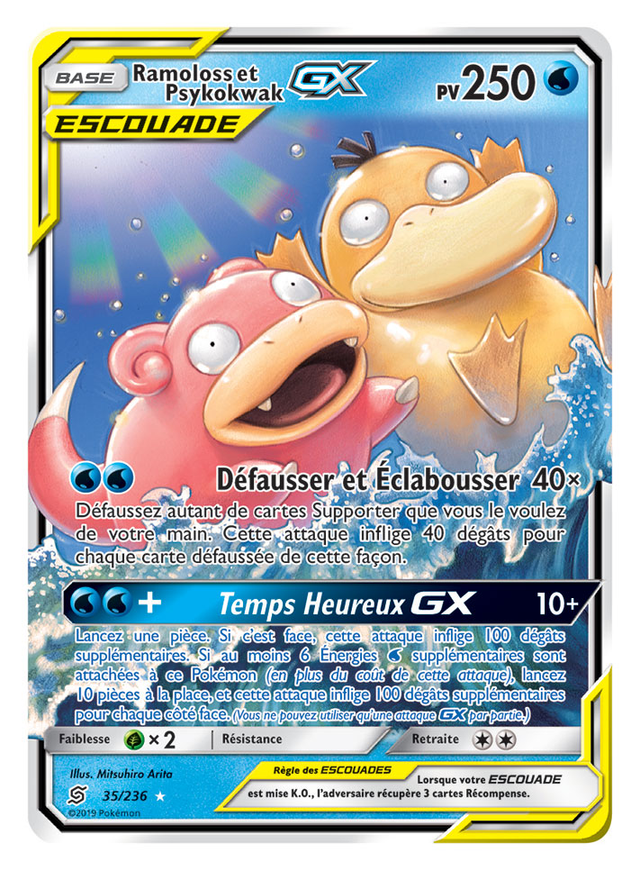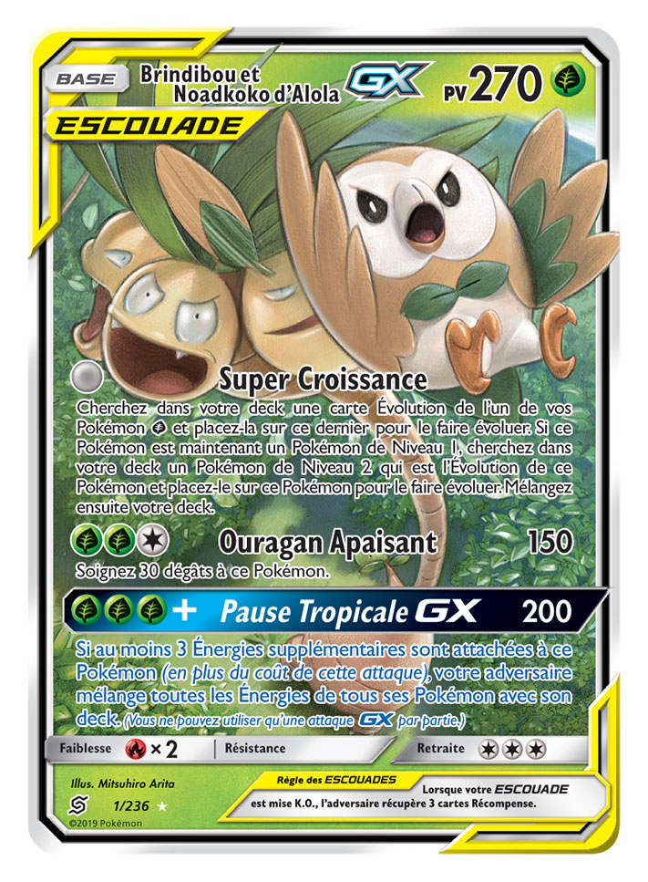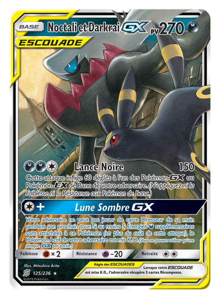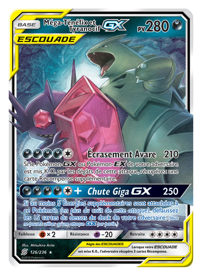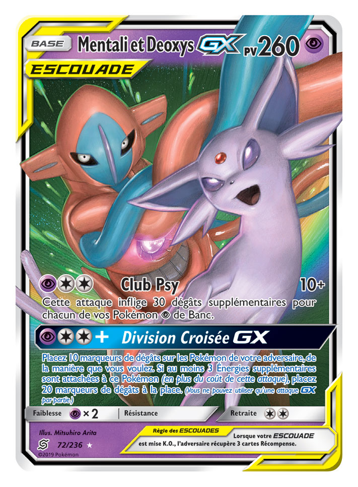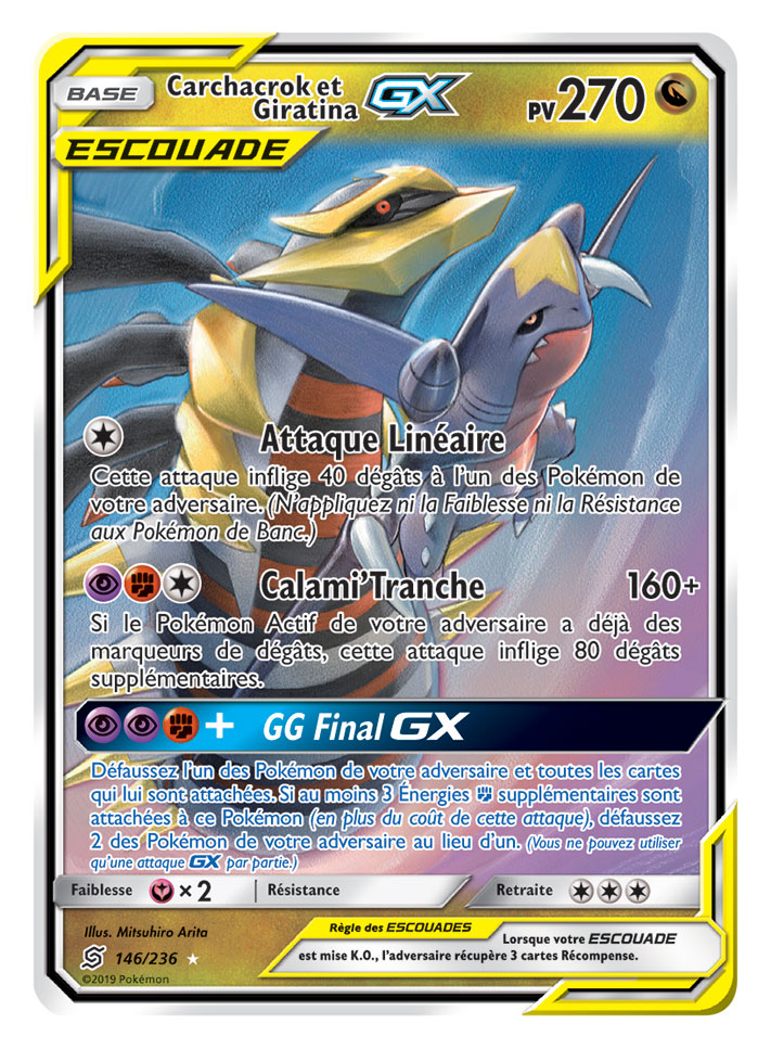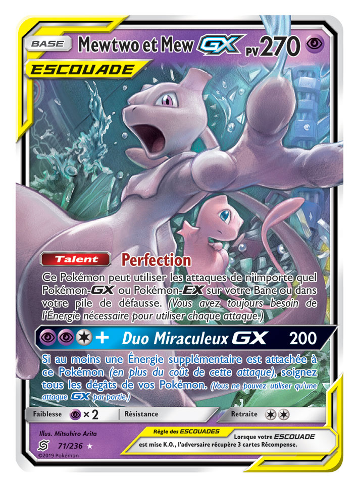 Dans cette extension, les fans retrouveront de nouvelles associations de Pokémon sur huit nouvelles cartes Pokémon-GX ESCOUADE, dont Mewtwo et Mew-GX, Ramoloss et Psykokwak-GX, Brindibou et Noadkoko d’Alola-GX, et Carchacrok et Giratina-GX, entre autres. De plus, l’extension offrira neuf Pokémon-GX supplémentaires, plus de 25 cartes Dresseur et deux nouvelles cartes Énergie spéciale.