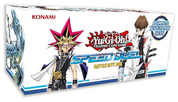Speed Duel : Boîte Bataille-Villeest conçue pour permettre à 8 duellistes de s’affronter comme bon leur semble. Elle renferme 200 cartes permettant de construire des stratégies populaires, et compte des cartes iconiques inédites au Speed Duel. Les puissants Dieux Égyptiens Obelisk, le Tourmenteur, Slifer, le Dragon Céleste, et Le Dragon Ailé de Râ sont invoqués, tandis que Jinzo, Paladin des Ténèbres et Canon Dragon XYZ contre-attaquent.
