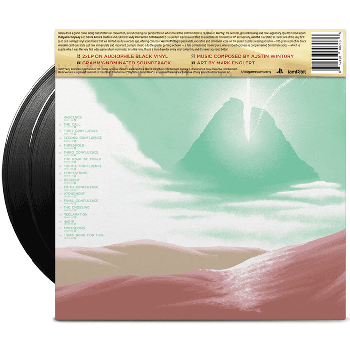 Journey, l’opus fondateur, révolutionnaire et désormais légendaire des développeurs thatgamecompany et Santa Monica Studios et de l’éditeur Sony Interactive Entertainment, en est la parfaite expression. Pour fêter son 10e anniversaire, iam8bit est ravi de revisiter l’une des toutes premières bandes sonores en vinyle (et l’une des plus vendues) que nous avons produite il y a près de dix ans, en proposant la partition passionnée, évocatrice et émotionnelle du compositeur Austin Wintory sur un pressage de la plus pure qualité possible : un vinyle noir audiophile de 180 grammes.