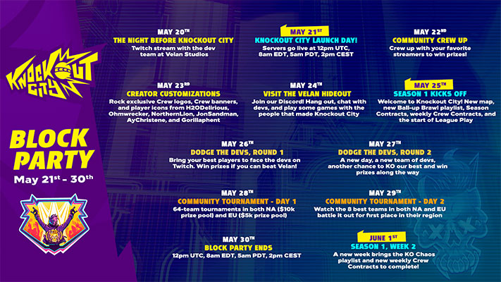 Knockout City, le titre dédié au ballon prisonnier de Velan Studios, organise une Block Party dans le jeu le 21 mai, un festival gratuit offrant 10 jours consécutifs de fête non-stop du 21 mai 5 h 00 PT/8 h 00 ET au 30 mai 5 h 00 PT/8 h 00 ET. EA et Velan accueillent tous les spécialistes de la bagarre, sur toutes les plateformes, pour jouer en bande et se battre pour conquérir Knockout City gratuitement pendant 10 jours, dès la sortie du jeu !