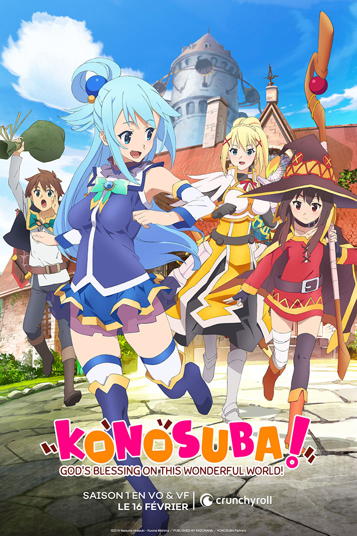 Synopsis : Après avoir perdu la vie dans un accident de la route, Kazuma Satô voit apparaître devant lui une ravissante déesse, Aqua. Elle lui propose d’être réincarné dans un autre monde et d’emporter une seule chose avec lui. Kazuma choisit… la déesse ! Les voici transportés dans un pays sous la coupe d’un terrible roi démon. C’est le début de nombreuses aventures, car si Kazuma n’aspire qu’à la paix et au calme, Aqua se préoccupe beaucoup des problèmes des gens qu’ils croisent. Et cela ne plaît pas du tout au roi…