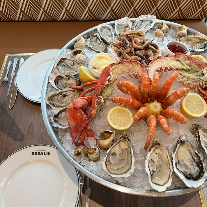 Ouvert dès 8h30 pour le petit-déjeuner et jusqu’en fin de soirée, Brasserie Rosalie satisfera les papilles des amateurs de gastronomie française, avec des classiques tels que les escargots de Bourgogne, la soupe à l’oignon gratinée, le cocktails avocat-crevettes, et une large palette d’huîtres et de fruits de mer. Parmi les spécialités, notons l’élégante soupière de homard en croûte, le fondant de bœuf braisé, la choucroute Rosalie, la blanquette de veau à l’ancienne ou encore les moules au Chablis à la crème d’Isigny. Le comptoir extérieur, adossé à la brasserie, propose également une offre de sandwichs, salades, jus frais et pâtisseries françaises à emporter, pour manger sur le pouce.
