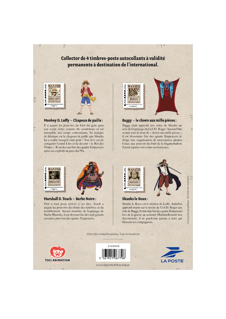 Pour célébrer cet univers fascinant, La Poste émet un timbre mettant à l’honneur Luffy, un carnet de 12 timbres autocollants illustrant les membres de l’équipage de Chapeau de Paille ainsi que leur célèbre navire, le Thousand Sunny ; et un collector de 4 timbres « Les quatre nouveaux empereurs ».