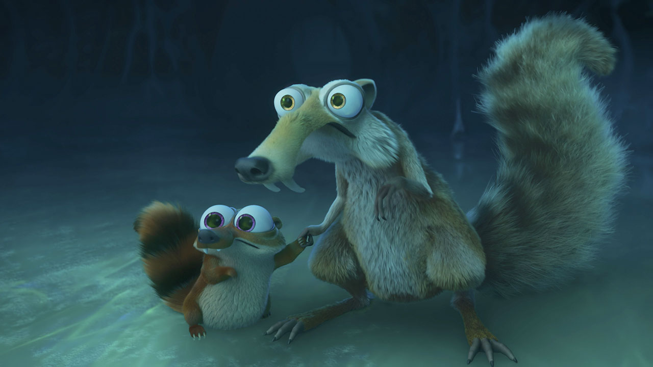 Scrat et Baby Scrat tentent de rattraper le Gland tombé dans une grotte obscure qui ressemble à une galerie des glaces effrayante. - « Teeter Toddler » de Jeff Gabor (HORTON) et Donnie Long. Scénario : Galen Tan Chu.