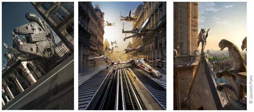 Grâce à sa passion et son talent, le photographe parisien Laurent Pons revisite l’univers de Star Wars en plaçant des modèles et des maquettes de la saga dans la réalité. Sa série réimplante le monde imaginé par Georges Lucas dans un Paris contemporain. Entre photographie et retouches sur Photoshop, l’artiste abat la frontière entre cinéma et réalité, et créé une atmosphère surréaliste, qui transporte dans une galaxie lointaine.