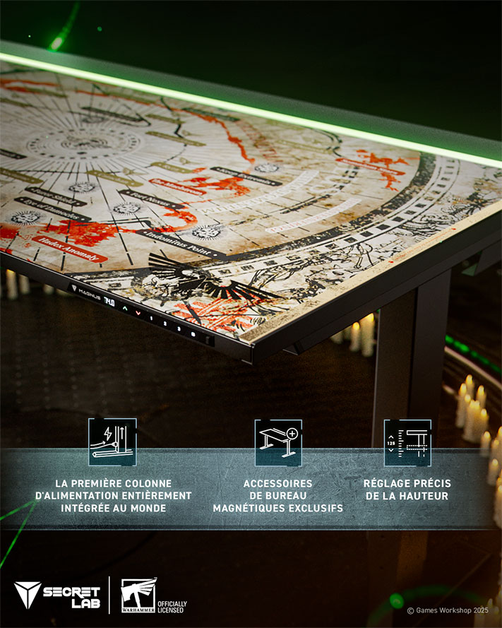 Le bureau assis-debout Secretlab MAGNUS Pro édition Warhammer 40,000 est l’extension de la collection officielle Secretlab Warhammer 40,000. Conçue en collaboration avec Games Workshop, cette nouvelle addition s’associe parfaitement avec la précédente édition Secretlab TITAN Evo Warhammer 40,000 Ultramarines pour transformer votre setup en terrain de préparation ultime pour les jeux vidéo Warhammer et les activités de modélisme sur table.