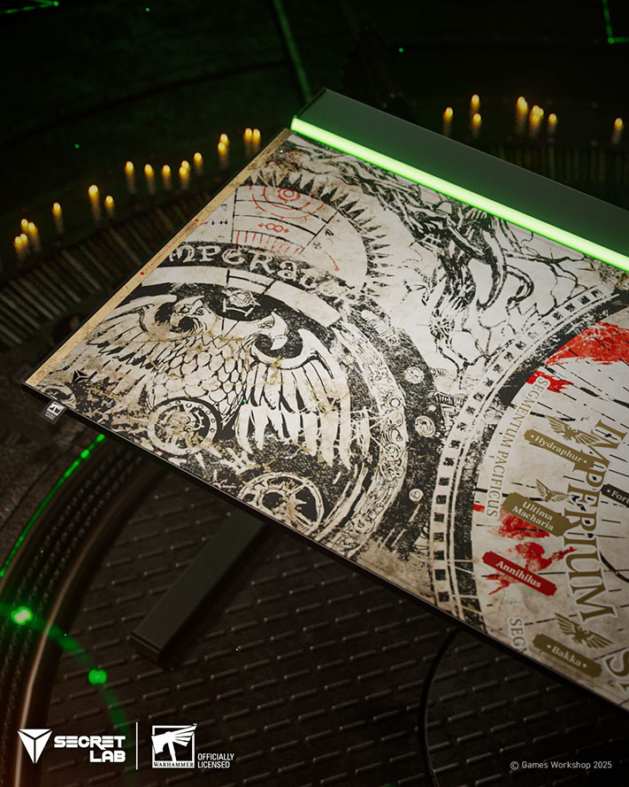 au centre, le bureau réglable en hauteur Secretlab MAGNUS Pro et le tapis de bureau Secretlab MAGPAD™ édition Warhammer 40,000 inclus rendent hommage au Monde-Trône de l’Imperium.