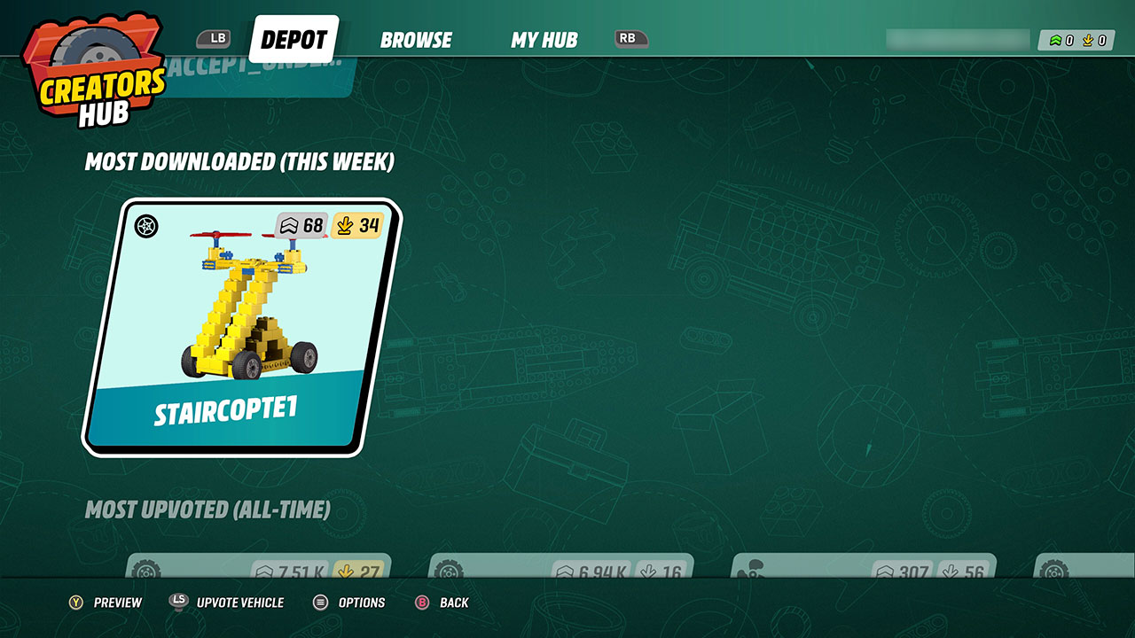 En ouvrant le menu du Centre des Créateurs pour la première fois, vous vous retrouvez dans le Dépôt, où les véhicules les plus populaires sont présentés. Vous découvrirez immédiatement les créations ayant remporté le plus de votes et ayant été les plus téléchargées par la communauté LEGO 2K Drive. Le Centre des Créateurs inclut un certain nombre de fonctionnalités qui encouragent la créativité et le partage :