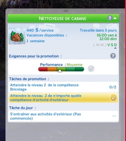 Cette carrière fonctionne sur un modèle inédit : votre sim travaille seulement trois jours (vendredi à dimanche), mais il peut réaliser des actions à distance pour améliorer sa performance. Ce n’est pas une carrière « facile », car la progression dépend de vos choix et de vos efforts — et c’est justement ce qui la rend fun et gratifiante ! Petit tips : profiter des jours de repos pour monter un max de compétence (bricolage, fitness, etc…) et avant de partit au travail montez les barres de besoin au max !