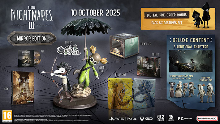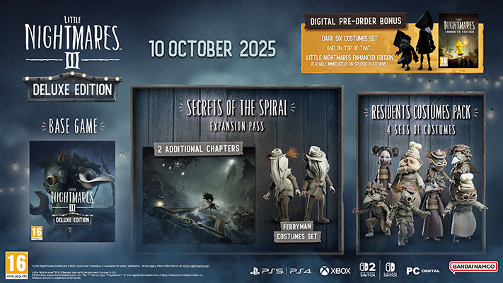 Les joueurs qui précommanderont le jeu auront accès à l’ensemble de costumes « l’Ombre de Six » sur toutes les plateformes. De plus, pour toute précommande au format numérique, les joueurs bénéficieront d’un accès anticipé à Little Nightmares Enhanced Edition sur PlayStation 5, Xbox Series X|S et PC. Le Pass d’extension Les Secrets de la Spirale inclut deux chapitres supplémentaires qui seront dévoilés ultérieurement ainsi que des ensembles de costumes exclusifs associés à un personnage que les fans ne manqueront pas de reconnaître.