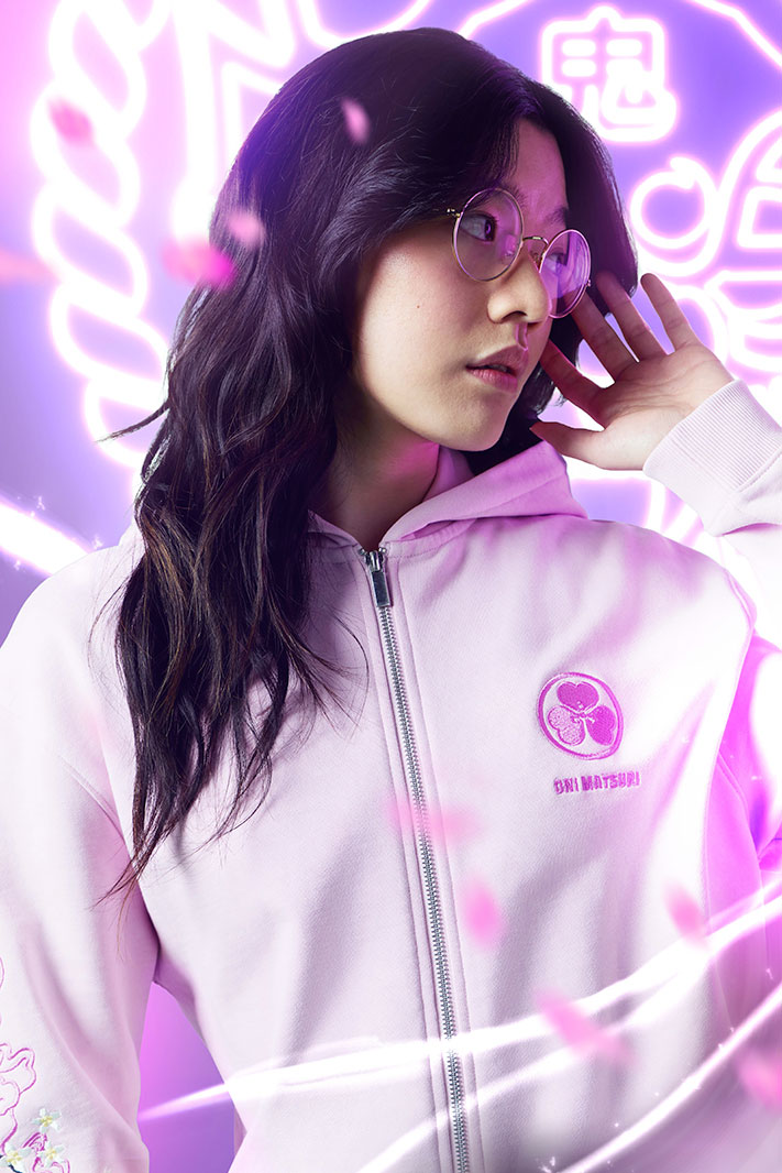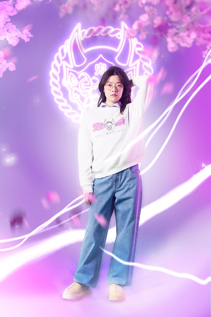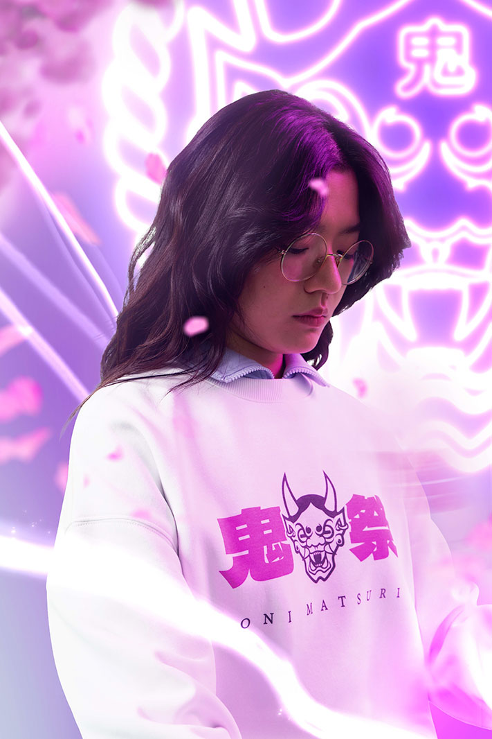 Ce sweatshirt blanc comme neige est décoré d’un motif composé des kanji Oni Matsuri en rose, et du masque de démon qu’on retrouve sur le reste de la collection. Des couleurs qui ne manquent pas de rappeler les cerisiers en fleur ! On retrouve également la mention “Oni Matsuri” sous le visuel.