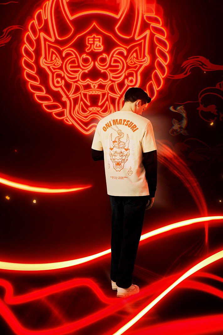 C’est à nouveau son univers de l’Oni-Matsuri qui prend vie : 3 T-shirts, 3 sweatshirts, un jogging et un kimono chez celio, la collection s’étend pour la première fois chez la femme avec un T-shirt et deux sweatshirts.