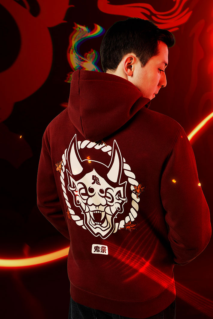 Cette fois-ci, c’est sur un sweatshirt rouge à capuche qu’on retrouve l’emblème aux pétales de fleurs à l’avant. L’arrière est décoré d’une illustration blanche composée d’un masque de démon entouré de feuilles d’érable, et des kanjis 鬼祭 “Oni Matsuri” en dessous.