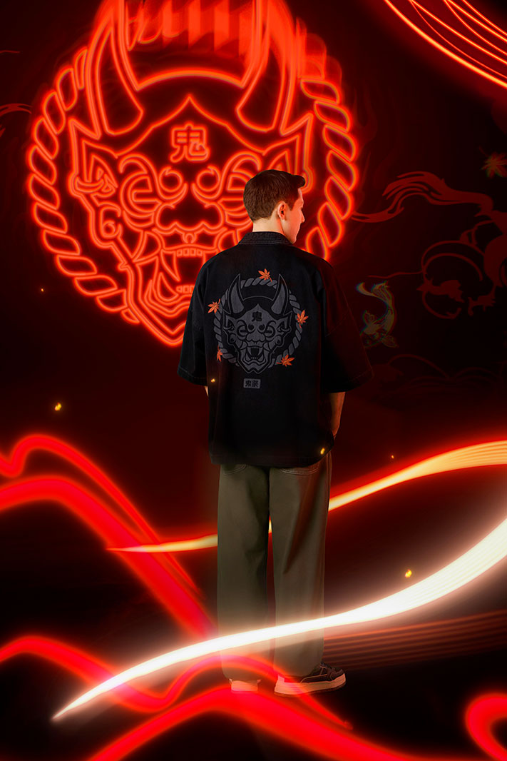 Pièce maîtresse de la collection, ce Kimono en denim est décoré d’une illustration laser print représentant le masque d’Oni et des feuilles d’érable dans le dos.
