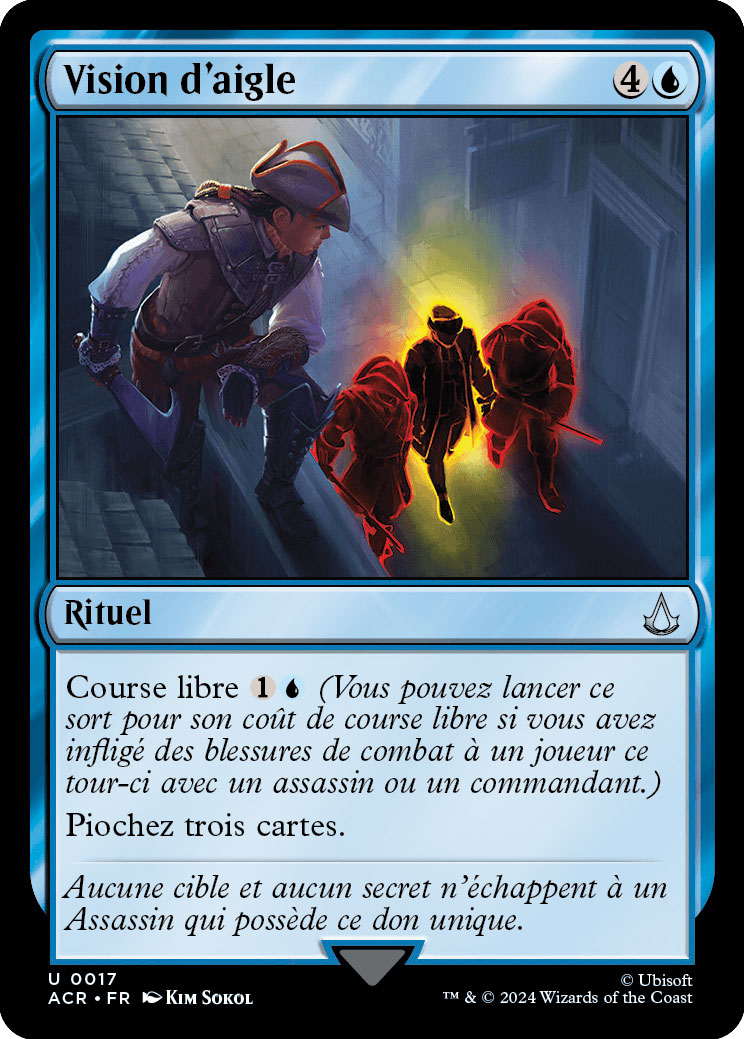 Un assassinat se termine uniquement après que vous avez fui de manière spectaculaire, en bondissant d’immeuble en immeuble et par-dessus les obstacles qui se dressent sur votre chemin. Course libre est un nouveau coût alternatif vous permettant de lancer des sorts en échange d’un peu de vos économies si, plus tôt dans le tour, un assassin ou un commandant que vous contrôliez a infligé des blessures de combat à un joueur.