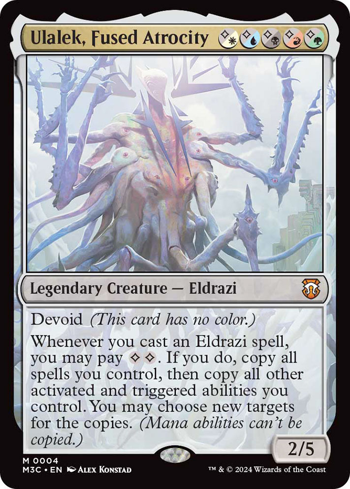 Pour finir, l’extension sera également disponible sous la forme de quatre decks Commander prêts à jouer : un deck bleu-vert Terrain Traître, un deck noir-rouge-vert Cimetière en Effervescence, un deck blanc-bleu-rouge Énergie Créatrice, et un deck cinq couleurs Incursion Eldrazi. Un traitement spécial sera appliqué à l’ensemble des 100 cartes de chaque deck Commander, et deux cartes de créatures légendaires sans bordure seront incluses dans chaque deck.