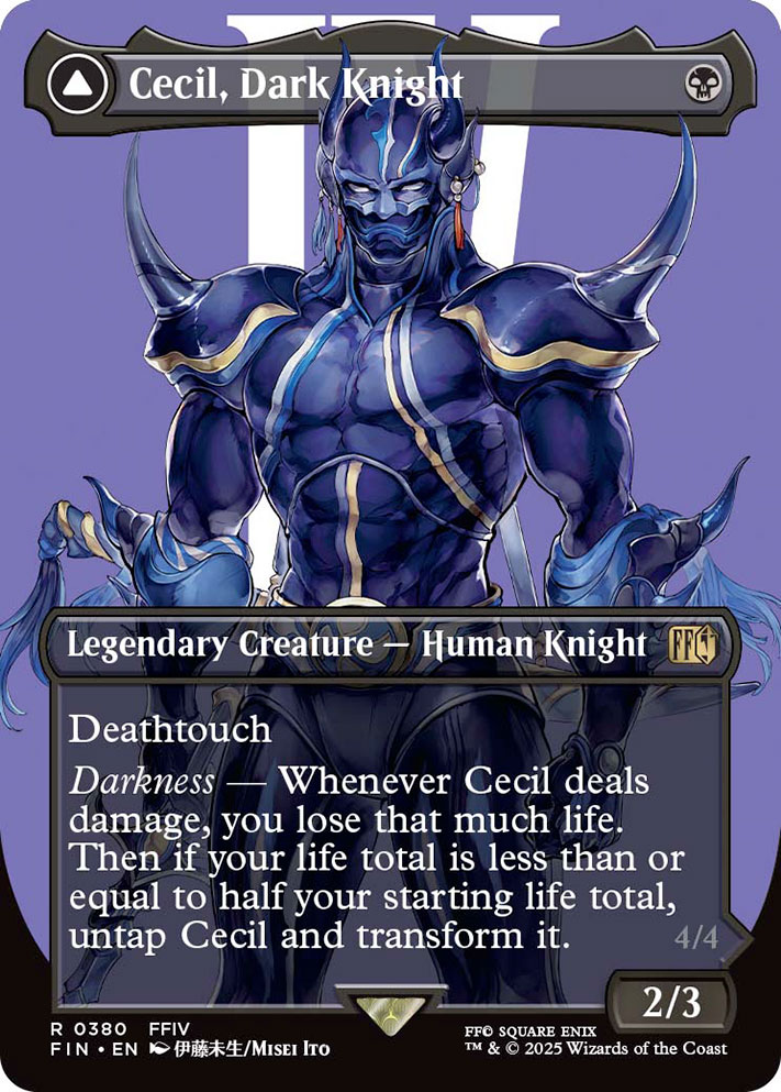 - Des cartes double face – Les cartes double face feront leur grand retour dans Magic: The Gathering – Final Fantasy. Il suffira de les jouer côté recto pour leur coût de mana et de remplir les conditions nécessaires pour les transformer et découvrir leur verso. Les cartes double face de l’extension représenteront des personnages, mini-jeux, et moments clés de Final Fantasy.