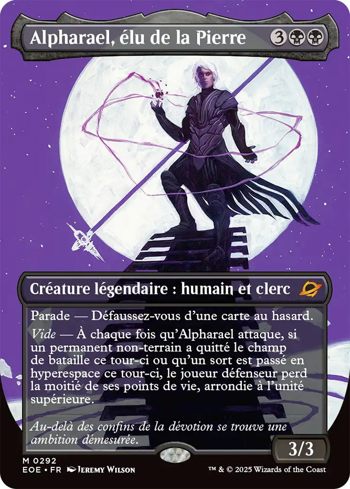 Dans l’espace, les batailles sont aussi acharnées que les victoires sont célébrées. Les cartes Triomphe sans bordure représentent seize personnages de l’extension au sommet de leur gloire sous un ciel étoilé. De leur côté, les cartes Cosmos Surréaliste font la part belle aux bizarreries de l’univers et plongent certaines des cartes les plus importantes de l’extension dans une atmosphère onirique.