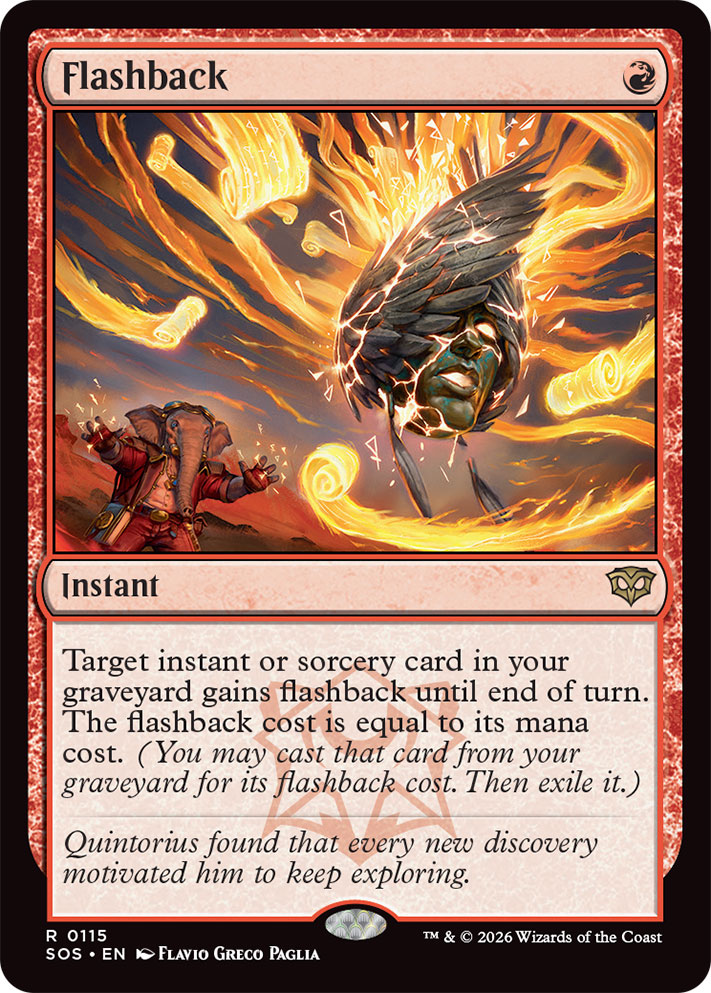 • Flashback (institut Forsapience) – Une mécanique de jeu bien connue des joueur·euses de Magic qui permet de lancer des sorts pour un coût alternatif depuis le cimetière.