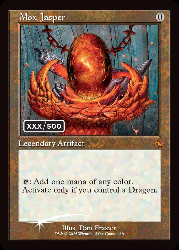 Tarkir : la tempête des dragons propose de nombreuses reliques convoitées par les clans, comme de nouveaux traitements thématiques et des illustrations alternatives. Le joyau le plus convoité de Tarkir est sans aucun doute le Mox de jaspe, un atout de taille pour tout deck dragon. Des cartes aux traitements ordinaires et draconiques sont disponibles dans les boosters de jeu et les boosters collector. La version sérialisée du Mox de jaspe, limitée à 500 exemplaires, dispose d’une illustration exclusive de Dan Frazier et d’un cadre rétro. Elle est uniquement disponible dans les boosters collector.