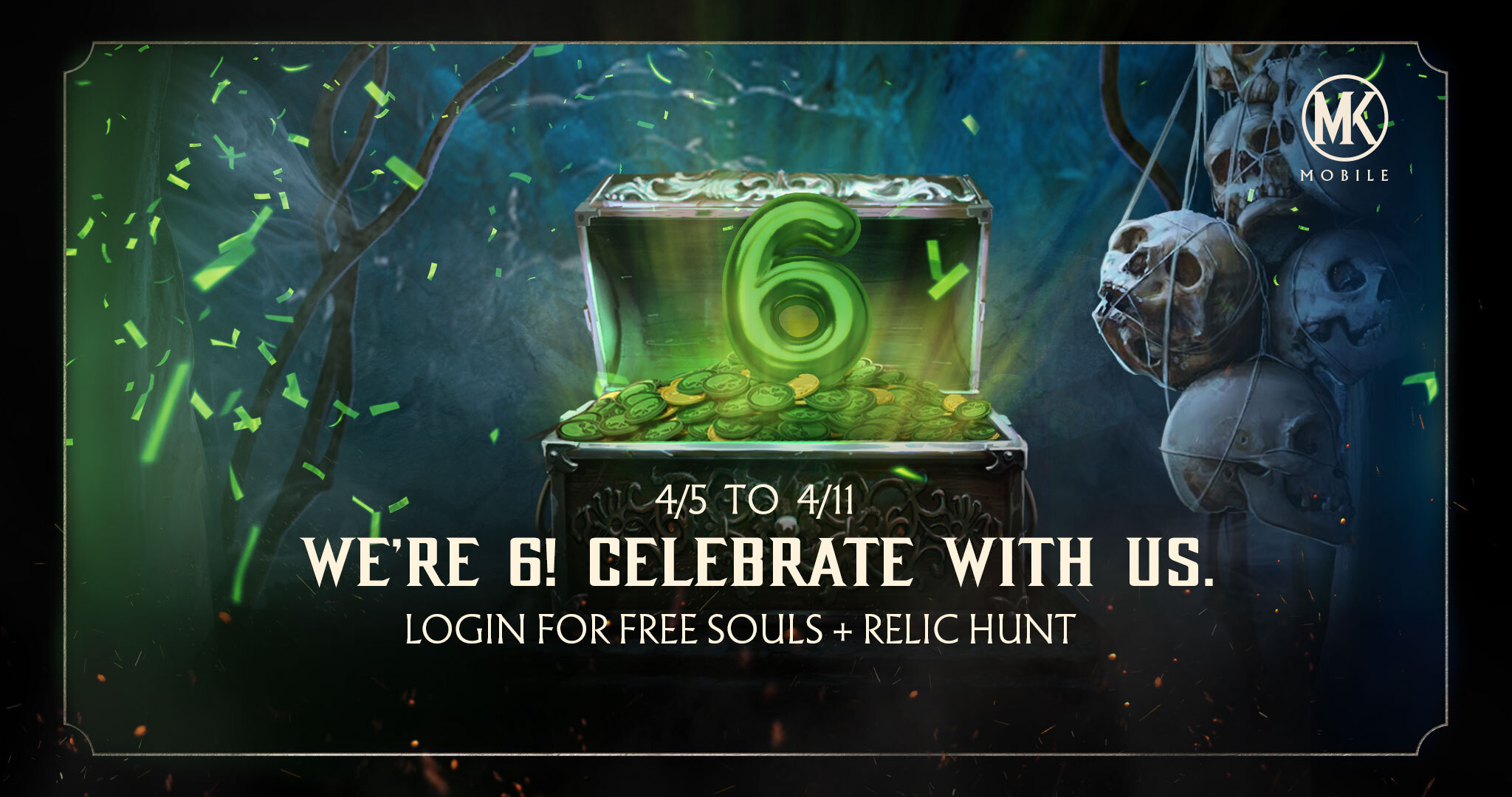 Pendant une durée limitée, l’événement « Chasse aux reliques » sera également de retour dans le cadre de la célébration du sixième anniversaire de Mortal Kombat Mobile, et sera disponible du 5 au 12 avril. Ce mode défi adoré des fans permet aux joueurs de se battre dans une succession de tours avec une unique mission : libérer Shao Kahn. Des reliques vous attendent au sommet de chaque tour contenant des fragments de l’esprit de Shao Kahn cachés par les Dieux Anciens. Lorsque suffisamment de fragments d’esprit sont rassemblés, le joueur débloque une carte Shao Kahn Diamant qui peut être améliorée jusqu’au niveau de Fusion X. Mortal Kombat Mobile offrira aussi 50 âmes gratuites chaque jour pendant une semaine, du 5 au 11 avril.