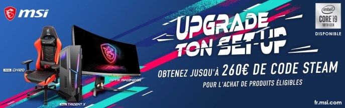 Du 1er juillet au 31 août 2020, MSI vous offre jusqu’à 260€ sur votre portefeuille Steam pour tout achat de certains modèles ou combinaisons, notamment les desktops de 10ème génération, les moniteurs et les fauteuils gaming.