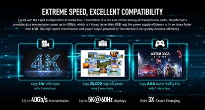 Le MEG Aegis Ti5 dispose de la technologie de transmission Thunderbolt 3. Grâce à la capacité de transfert jusqu’à 40 Gb/s, soit 8 fois plus rapide que l’USB 3.2 Gen 1, les utilisateurs peuvent rapidement stocker 40 à 50 Go de vidéo haute définition 4K. La partie réseau du MEG Aegis Ti5 utilise la dernière solution 2.5G et, couplé au LAN 1G, les joueurs peuvent ainsi profiter d’une excellente expérience réseau sans aucune latence.