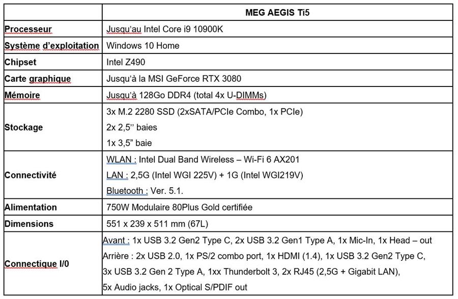 Le MEG AEGIS Ti5 sera disponible en France courant du 4ème trimestre, au tarif public conseillé à partir de 3799 euros TTC (version avec Core i7-10700K, RTX 3070 et 64Go de RAM)