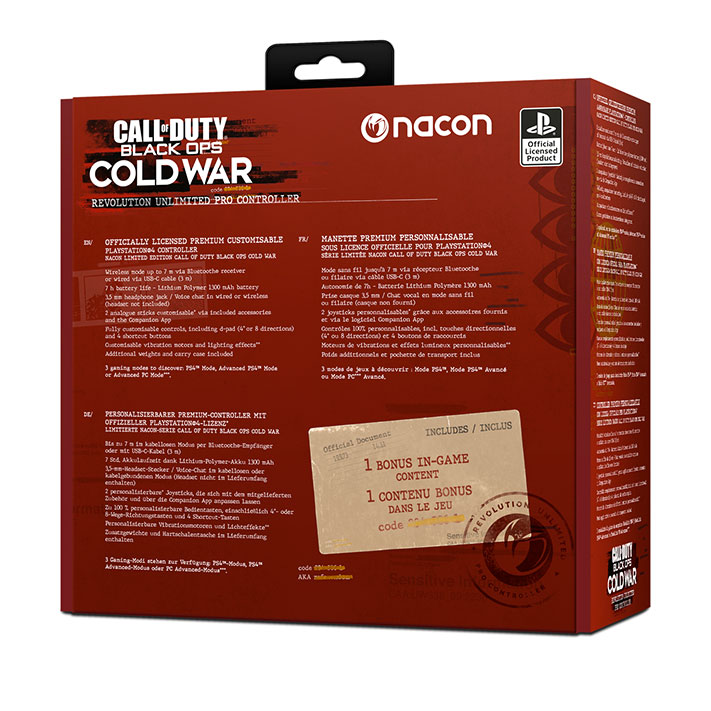Dotée d’un mode de jeu sans-fil, la manette Revolution Unlimited pour PlayStation 4 offre un niveau de performances exceptionnel et de nombreuses options de personnalisation plébiscitées par les joueurs compétitifs. Avec cette édition limitée au design inédit, directement inspiré de l’iconographie « Guerre Froide » développée dans le jeu, Nacon comblera sans aucun doute les plus grands fans de la franchise en quête de nouveaux challenges dans Call of Duty: Black Ops Cold War sur PlayStation 4.