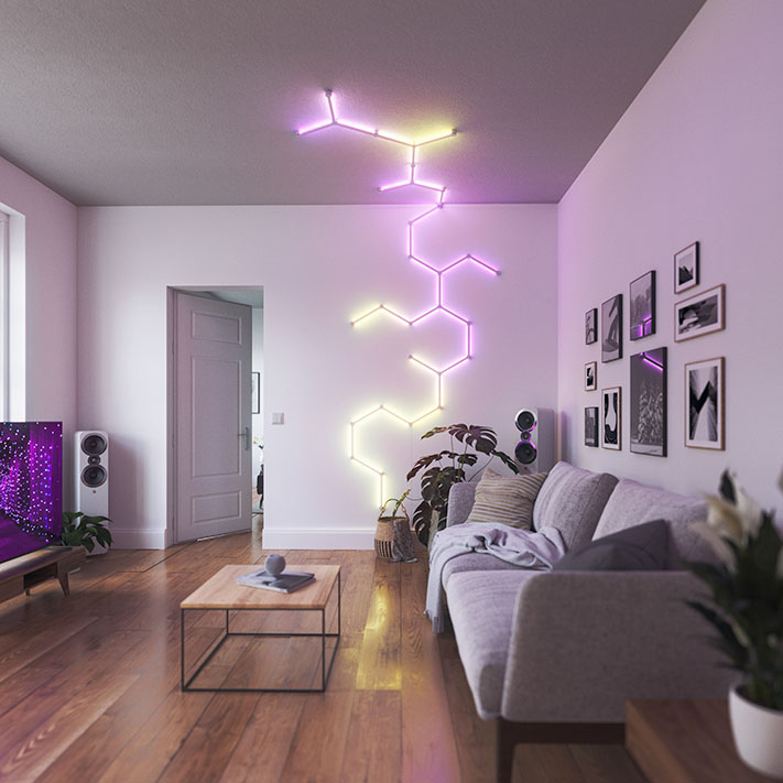 Les Nanoleaf Lines sont des barres lumineuses LED rétroéclairées à couleurs changeantes. L’aspect modulaire du produit permet à chacun de créer un agencement individuel et de l’adapter à ses préférences personnelles, à son espace et à son utilisation. Avec plus de 16 millions de couleurs et deux zones de couleurs par barre lumineuse, les possibilités de personnalisation sont infinies.