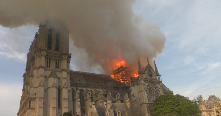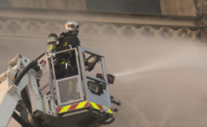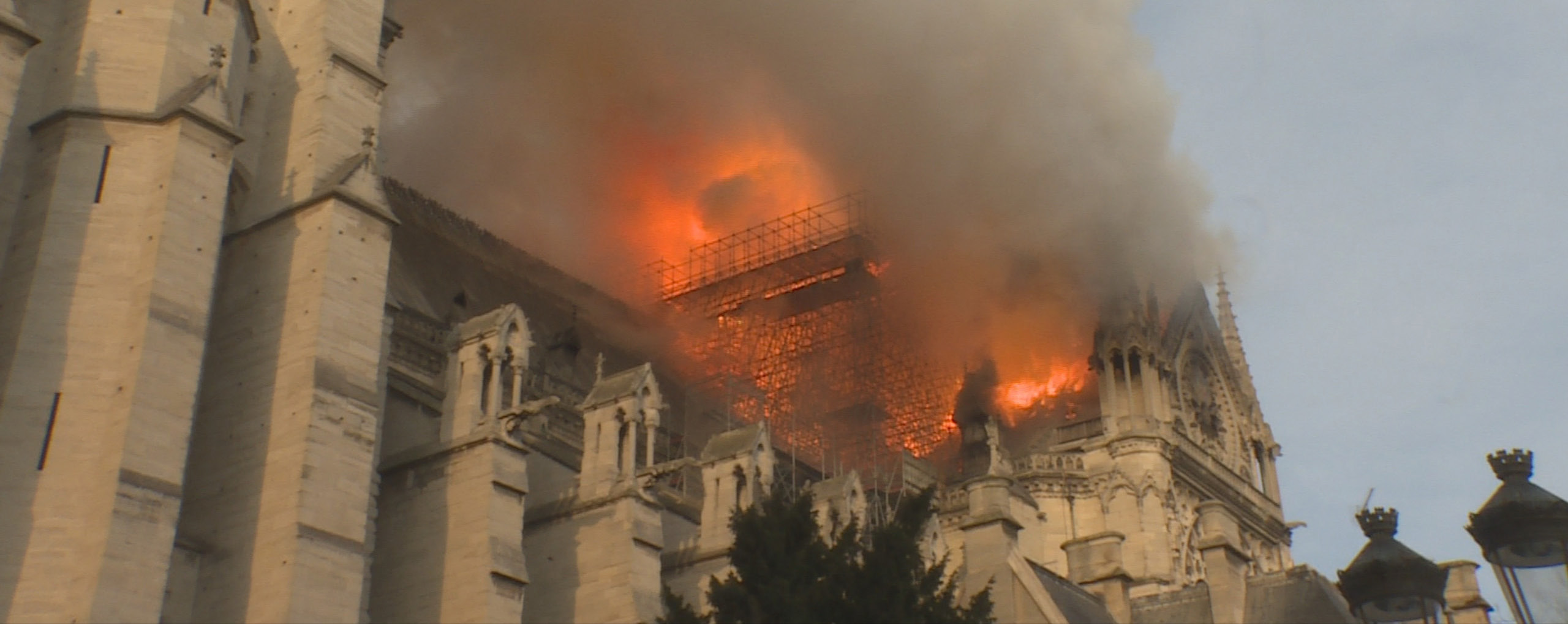 Confronté à un scénario équivalent à 500 incendies simultanés d’appartements, le corps des sapeurs-pompiers de Paris fait face à des conditions de plus en plus difficiles. Le vent balaie les flammes sur la charpente du toit, dévorant les poutres en chêne installées au Moyen Age. Le plomb fondu crache du toit dans les niches intérieures, menaçant les précieuses oeuvres d’art, les vitraux et les objets de culte, y compris la couronne d’épines que le Christ aurait portée lors de sa crucifixion. Lorsque la flèche – installée à l’origine pour remplacer celle du XIIIe siècle endommagée par la Révolution française à la fin du XVIIIe siècle – s’effondre et perce la voûte en plusieurs endroits, des ordres d’évacuation sont donnés.
