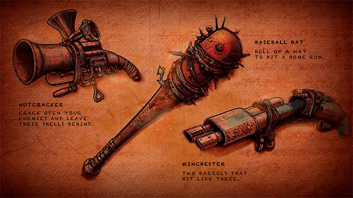 Au départ, chaque joueur dispose d’une arme et de deux emplacements d’objets dans leur inventaire. Entre les matchs, ils peuvent augmenter le nombre d’emplacements afin d’accroître leurs chances de victoire. Le choix de l’arme et de l’objet est laissé à l’appréciation du joueur. D’autres armes et objets sont disponibles : canon, guitare, fusil à pompe, arbalète, revolver Lucky Shot, pistolet hachoir à viande, batte de base-ball, hache, gant piège à ours, hélicoptère, grenade, mine cryogénique, générateur de bouclier, injection d’adrénaline, carburant pour fusée… le choix est large !