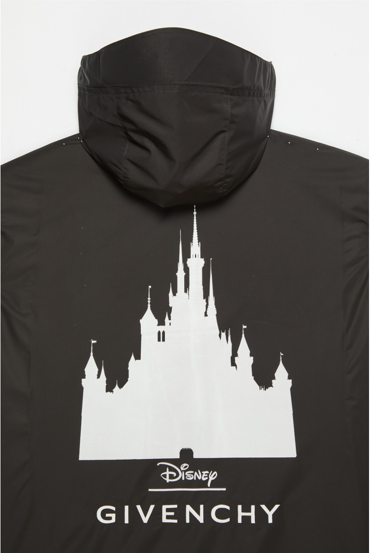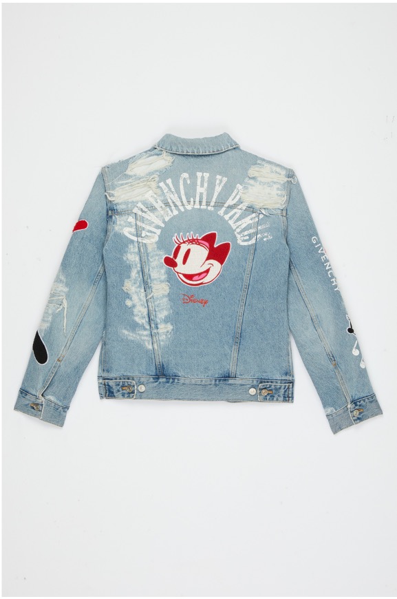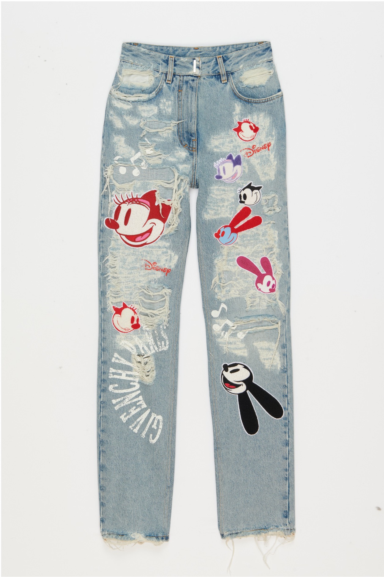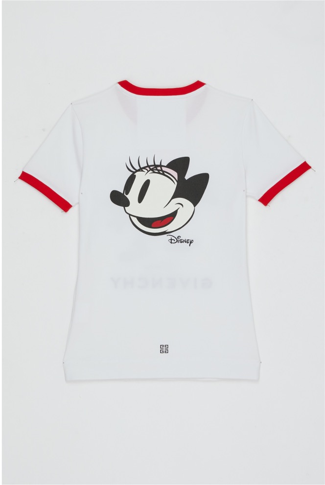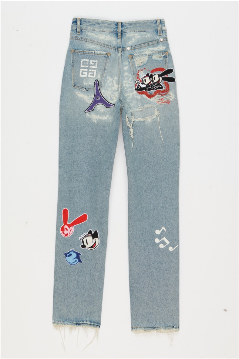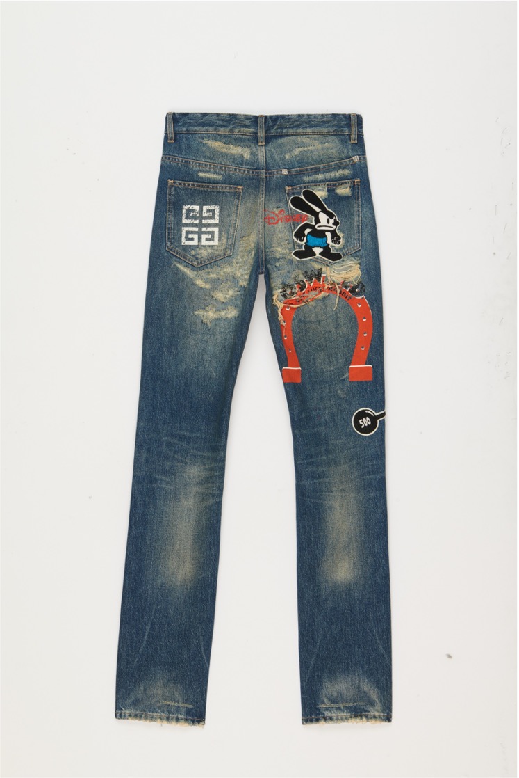 Parmi les essentiels pour les femmes, on trouve un teddy bleu à manches blanches avec les lettrages Givenchy et Paris montrant Oswald le lapin chanceux offrant une fleur à sa dulcinée, Ortensia. Sur une chemise oversize rouge vif et un ensemble de sport avec un short, Oswald apparaît sur un cheval en chantant. Les deux personnages reviennent tels des graffitis, à travers des motifs multicolores sur les jeans et les vestes. Les t-shirts aux multiples couleurs transmettent des messages d’amour et relatent la magie d’une visite à Paris, tandis que les sweats à capuche, les débardeurs et les pantalons de survêtement incorporent l’emblème 4G, stylisé en cœur, et le Magic Kingdom, en blanc cassé.