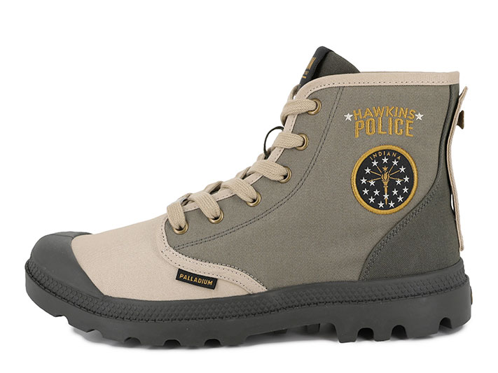 Inspirés par l’uniforme du chef Hopper et son sens inébranlable du devoir, ces modèles présentent une toile organique aux accents camouflage, des détails emblématiques de la police de Hawkins, ainsi qu’un lacet orné d’une plaque dorée rendant hommage à son badge.