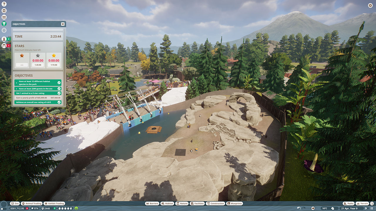 Un tout nouveau scénario chronométré est également inclus. Les joueurs se rendront dans l’Oregon, aux États-Unis, et s’occuperont de la gestion d’un zoo unique en son genre, installé autour d’un lit de rivière asséché. Ce lieu centré sur l’eau mettra à l’épreuve les compétences des joueurs avec ses restrictions d’espace. Avec ses nombreux dénivelés, il y a plus qu’assez de place pour les visionnaires. En complétant les habitats, en introduisant des animaux et en formant le personnel, il sera rentabilisé en un rien de temps.